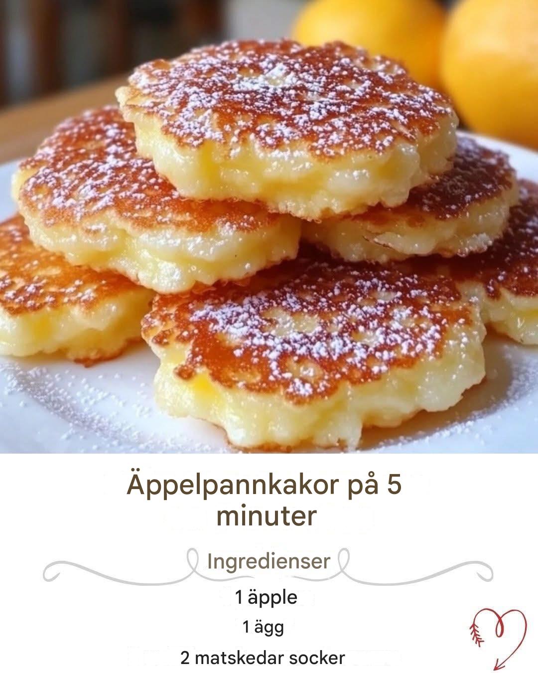 Dessa äppelpannkakor är snabba och enkla att tillaga, perfekta till frukost eller ett snabbt mellanmål. På bara 5 minuter har du fluffiga pannkakor med en aning äpple.