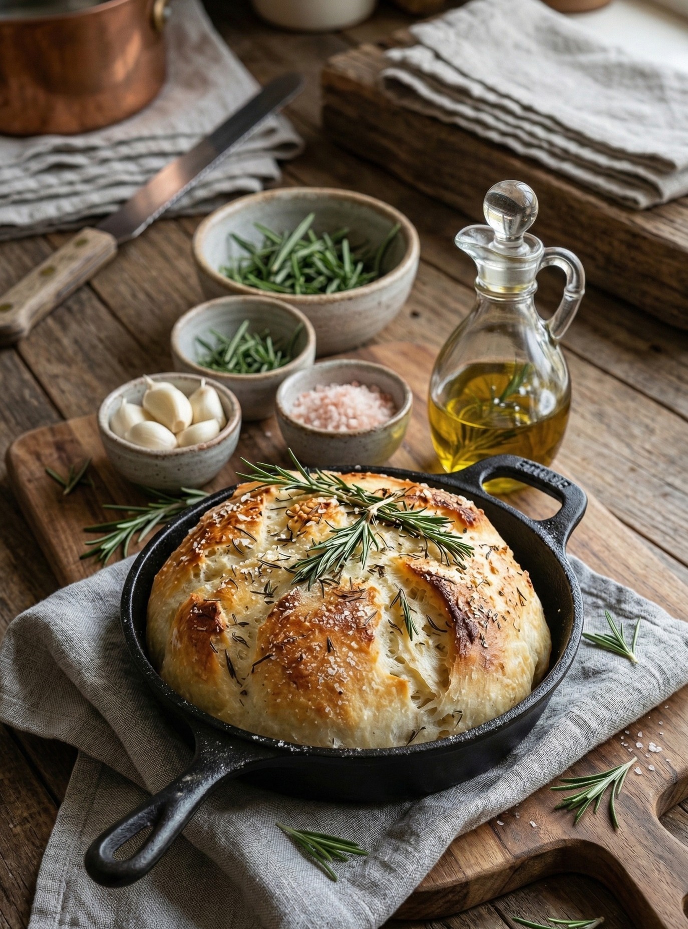 Det där ser ut som ett vackert, rustikt rosmarinbröd utan knådning . Det är en favorit för många eftersom det kräver tid snarare än muskler för att utveckla gluten, vilket gör det perfekt för alla som vill ha färskt bröd utan träning.