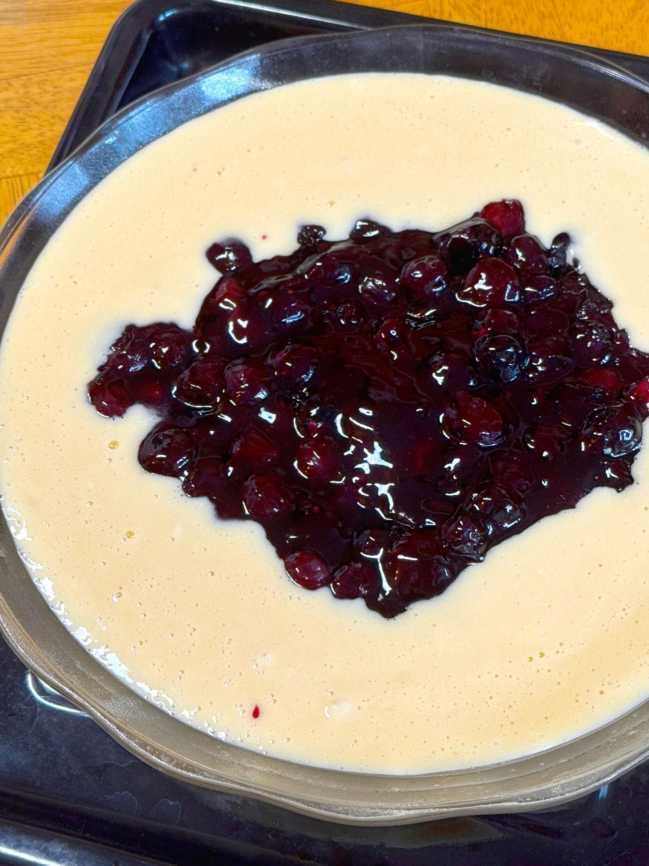 Denna Crazy Crust blåbärspaj är en utsökt variant på en klassisk dessert. Istället för ett traditionellt pajskal hälls en enkel, tunn smet i formen och blåbärsfyllningen placeras i mitten. När pajen gräddas bildar den "crazy crust" en mör, kakliknande botten och en lätt, luftig topp, vilket skapar en underbart unik konsistens och en fräsch, fruktig smak.