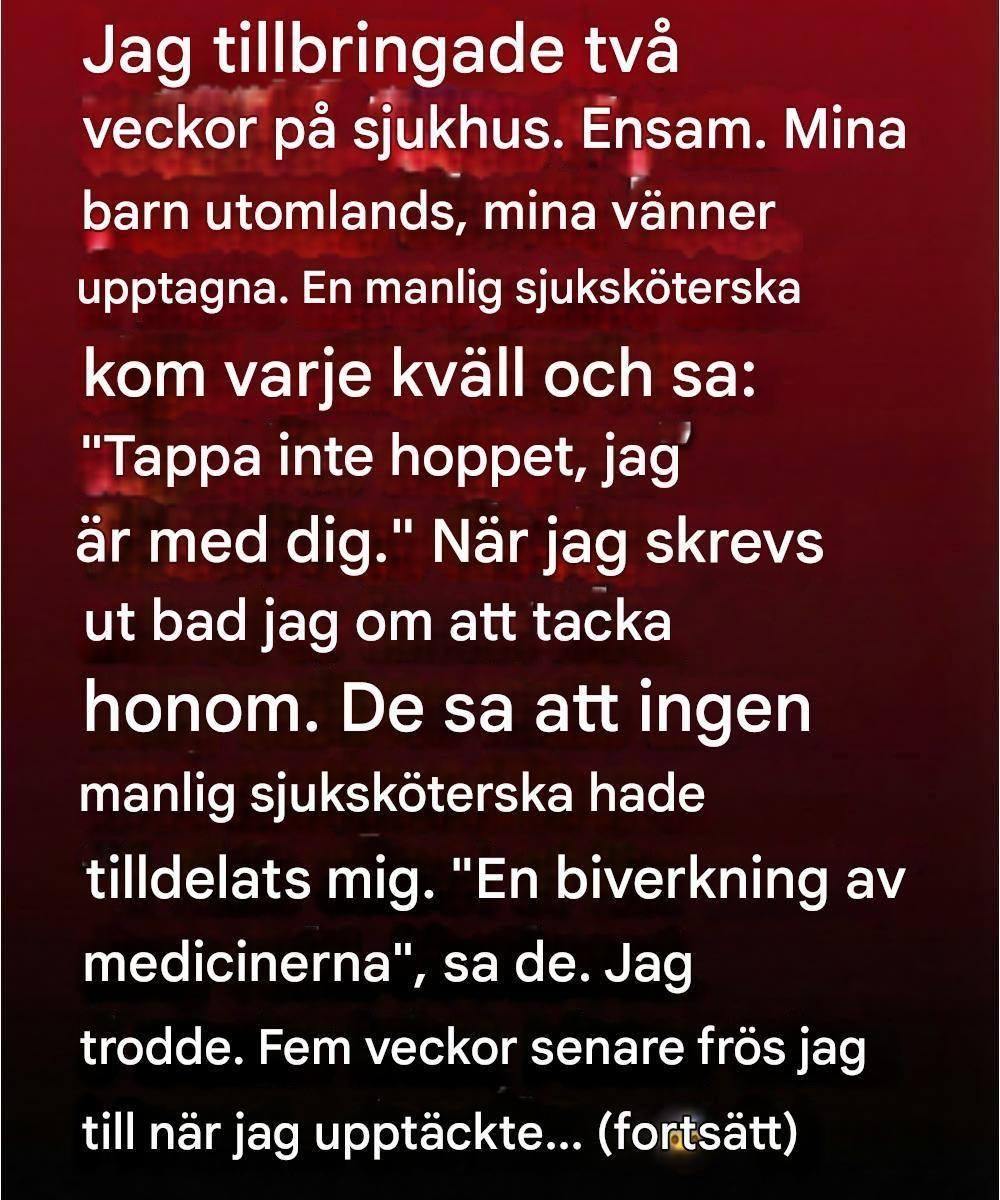 Det var enkla ord, men de betydde något. På en plats där allt kändes kliniskt och obekant, kändes hans närvaro personlig. Förutsägbar. Vänlig. Jag började se fram emot de korta besöken, inte för att de var extraordinära, utan för att de påminde mig om att någon märkte att jag var där. Att jag inte bara var ytterligare en journal eller ett sängnummer.