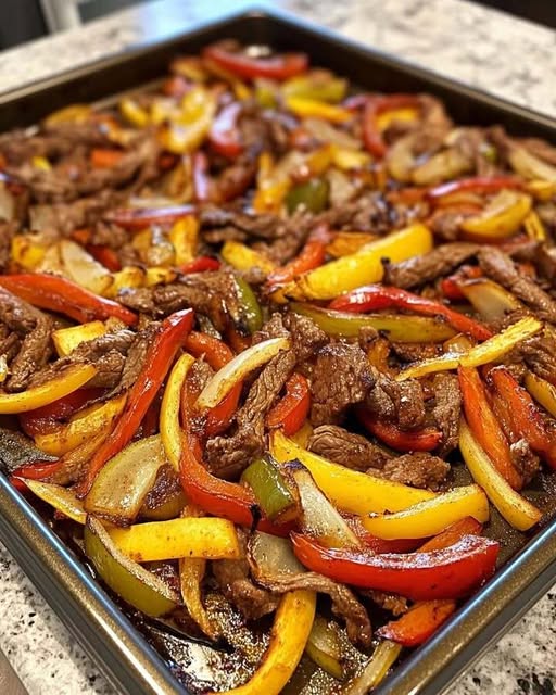 Dessa fräsande fajitas med nötkött på plåt är en färgglad, smakrik och lättlagad middag för hektiska vardagskvällar. Strimlor av marinerat nötkött, paprika och lök rostas tillsammans tills de är möra och karamelliserade – allt i en och samma plåt. Servera med varma tortillas eller ris för en mättande och publikvänlig måltid.