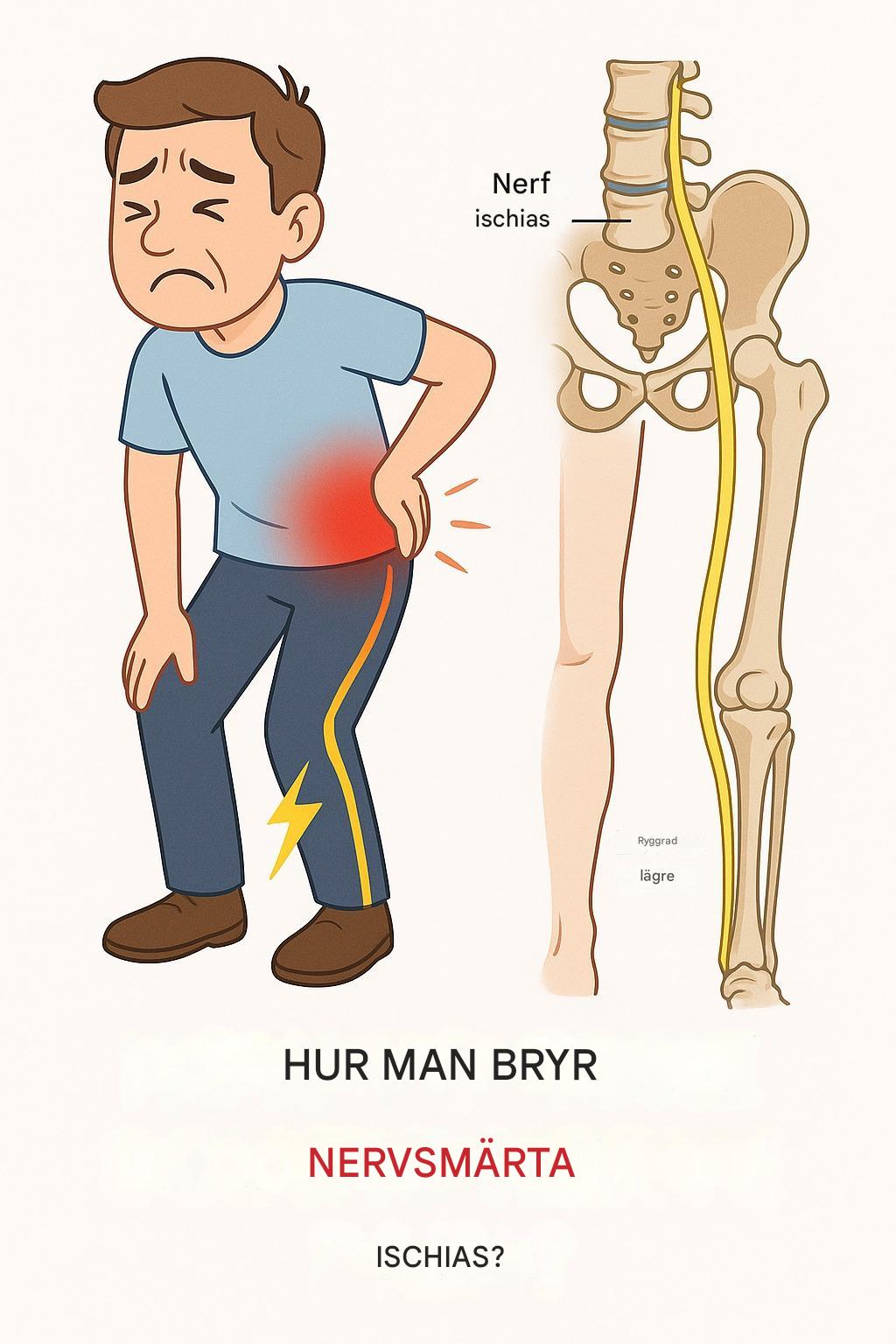 Ischiasnervsmärta, eller ischias, är ett vanligt och ofta försvagande tillstånd. Det uppstår när ischiasnerven, den längsta nerven i kroppen, är irriterad eller komprimerad. Denna nerv löper från nedre delen av ryggen, genom höfterna och skinkorna, och ner i varje ben. När den är klämd eller inflammerad kan smärtan variera från mild smärta till en skarp brännande känsla eller olidligt obehag som gör det svårt att sitta, stå eller gå.