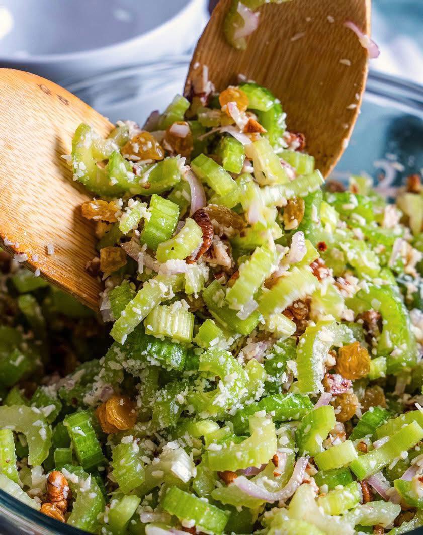 Denna Woodward-sellerisallad är en uppfriskande och smakrik sidorätt med en härlig kombination av texturer och smaker. Krispig selleri blandas med söta russin, krispiga pekannötter och tunt skivad schalottenlök, allt täckt med en ljus citron-honungsvinägrett och avslutat med den salta smaken av riven parmesanost.