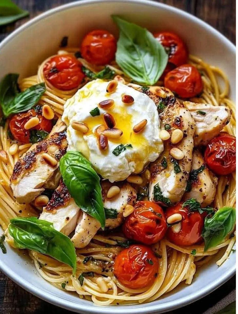 Färska örter, krämig burrata och gyllene kyckling gör denna pastarätt ljus, rik och full av smak.