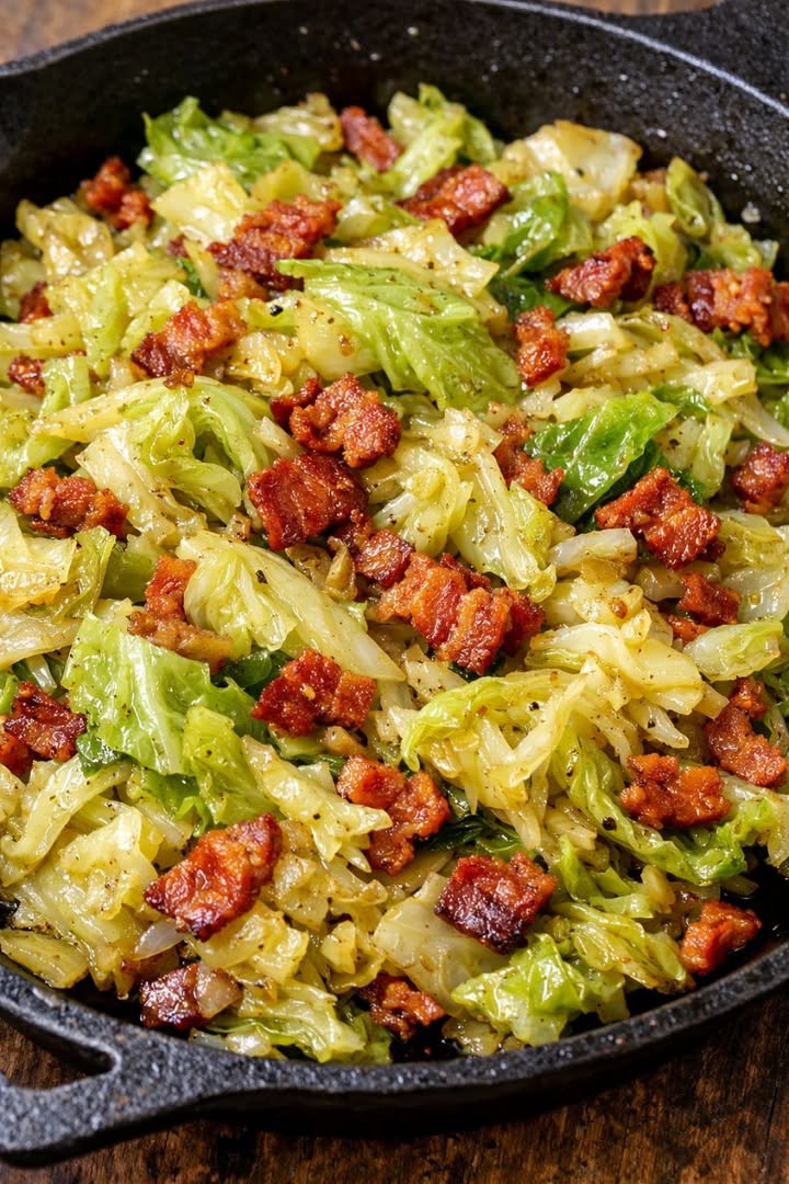 Servera denna stekta kål direkt ur gjutjärnspannan tillsammans med köttfärslimpa, stekt kyckling, bakade fläskkotletter eller en enkel stekt korv. Det är särskilt bra med majsbröd eller varma middagsrullar för att moppa upp bacon-y juicer. För en fylligare tallrik, tillsätt potatismos eller smörade äggnudlar och en enkel grön sallad. Det fungerar också vackert som en mysig brunch sida bredvid äggröra och rostat bröd.