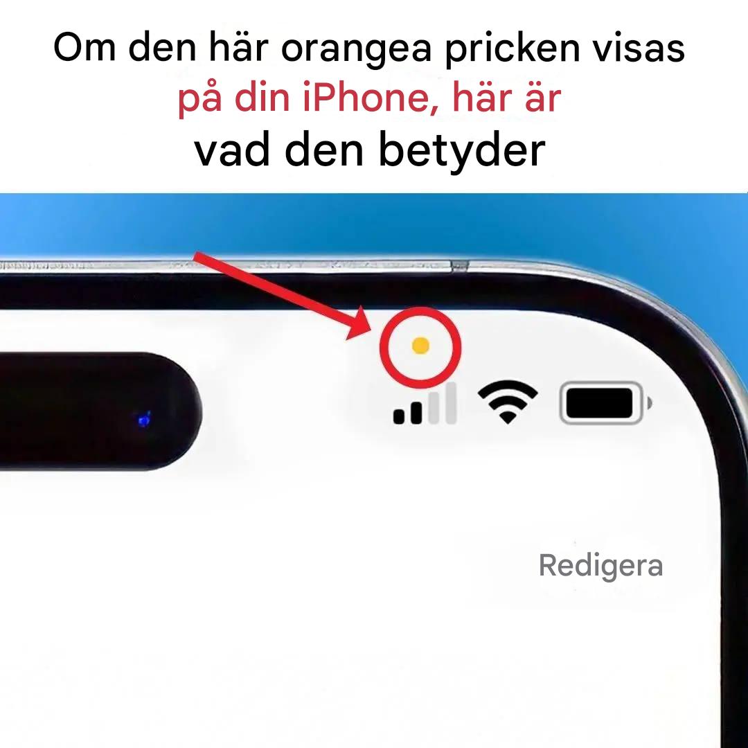 Enkelt uttryckt indikerar den orange pricken på din skärm att en app använder din telefons mikrofon . Denna prick är en säkerhetsåtgärd som Apple har infört för att meddela dig i realtid. När du ser den här signalen betyder det att en app spelar in ljud eller använder din mikrofon.