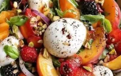 Njut av sommarens sötma med vår persikburrata-sallad, en symfoni av saftiga bär, färska persikor och krämig burrata-balsamvinägerglasyr! Ingredienser till persikaburrata-sallad…