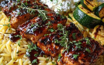 Balsamico-glaserad kyckling och orzo med vispad fetaost och grillad zucchini Ingredienser För kyckling- och balsamvinägerglasyren 450 g benfria kycklingbröst eller -lår utan…