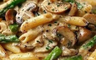 Denna krämiga kycklingpasta med vitlök och svamp är en utsökt måltid i en kastrull fylld med mör kyckling, svamp, sparris och en…