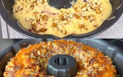 Bildtext: Din drömårta är bara 5 minuter bort! Denna mjuka, fluffiga sockerkaka har en söt syltvirvel och en krispig valnötstopping.…