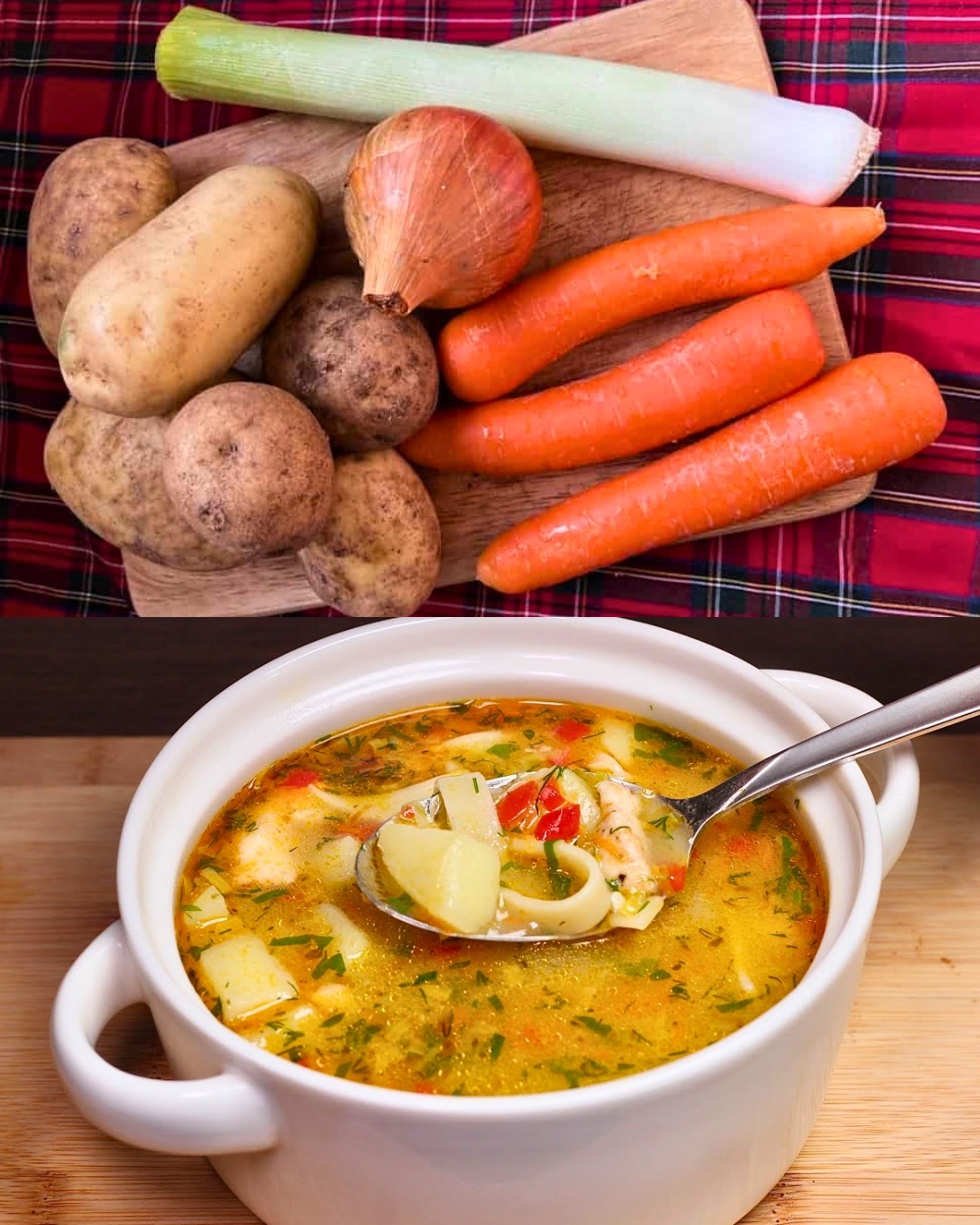 Denna rejäla kyckling- och grönsakssoppa är perfekt för en tröstande måltid året runt. Fullpackad med näringsrika ingredienser som kycklingbröst, purjolök, morötter, selleri och paprika, är denna soppa inte bara utsökt utan också mättande. Enkel att tillaga och full av smak, den kommer garanterat att bli en familjefavorit. Tillagningstid: cirka 45 minuter